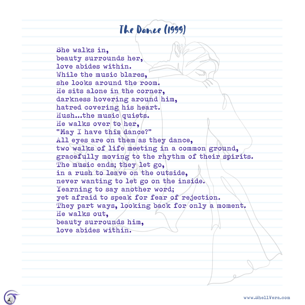 I wrote this version of this poem in 1999 to share my belief about the way people we meet influence our lives. Sometimes we walk into a room unknowingly about to find someone who will change our lives for the best, a person we will become great friends with, or the love of our lives. Other times, we are that person to someone else. Take time today to think of those individuals who you have “danced” with and think of the influence they had on your steps after that moment. Whether it was an intimate moment of deep conversation, a shared laugh over coffee, or a glance across a bookstore, there are people every day who help us become better and take away those “dark” places and the hatred that sometimes sneaks into our lives.